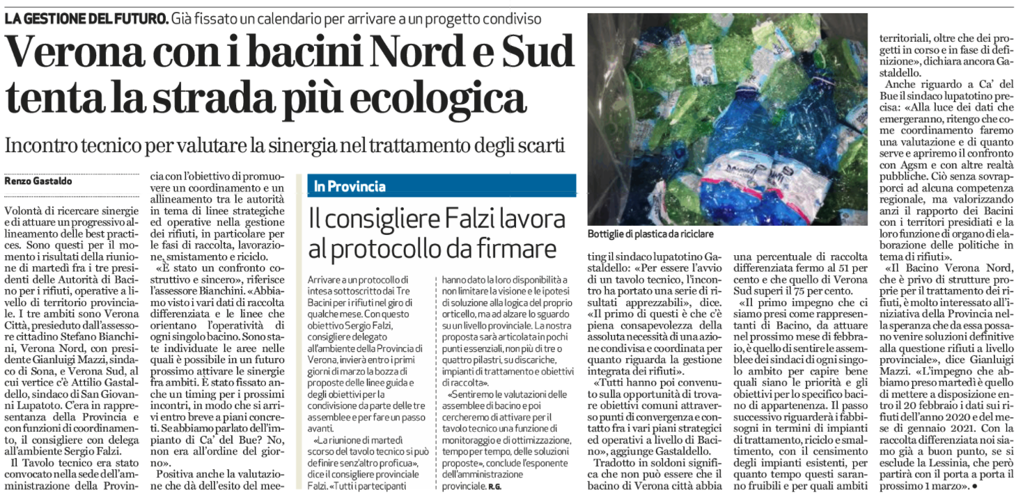 Si è tenuto oggi, negli uffici della Provincia di Verona, un incontro tra i Presidenti e i Direttori dei tre Bacini scaligeri, i funzionari della Provincia e il consigliere delegato Sergio Falzi.